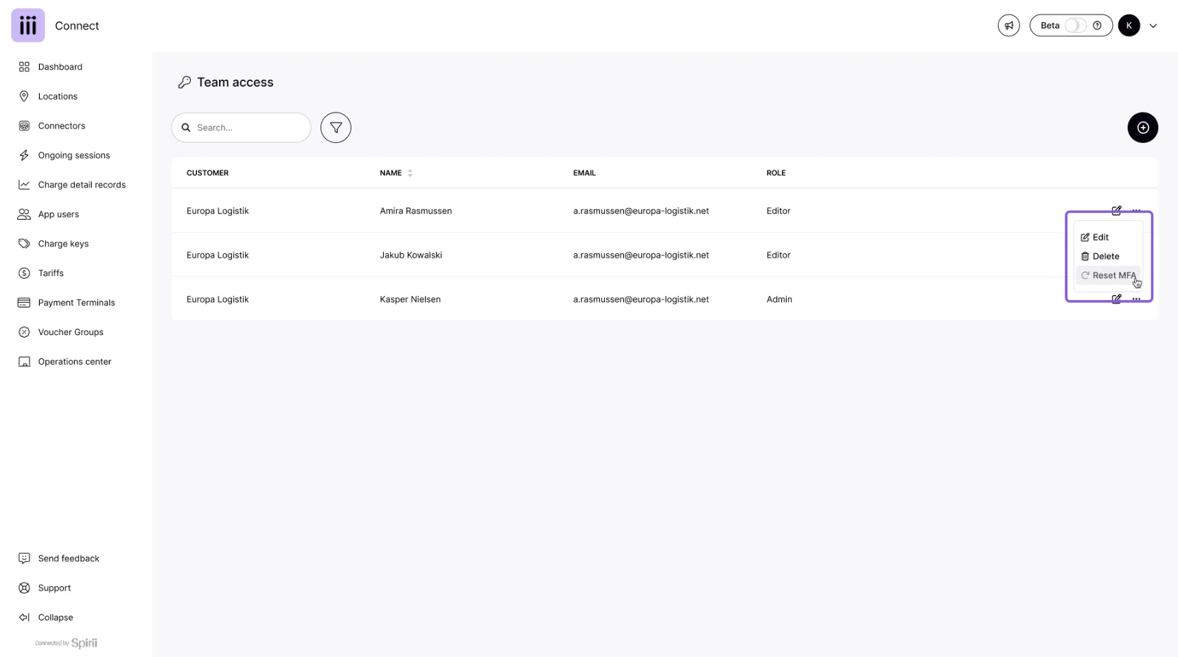 Only users with Operator or Editor roles can reset a user’s MFA. These are the same roles that have permission to create user accounts.