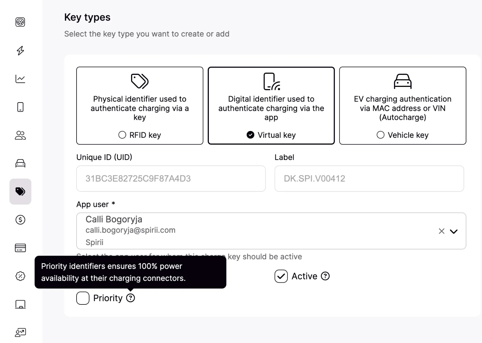 You can mark any charge key as prioritized through the Charge Key page in Connect. Find the charge key and hit the Edit icon, and mark the Priority feature. This ensures that any charging session authorized with the prioritized charge key receives the necessary charging priority. This also works on virtual charge keys.